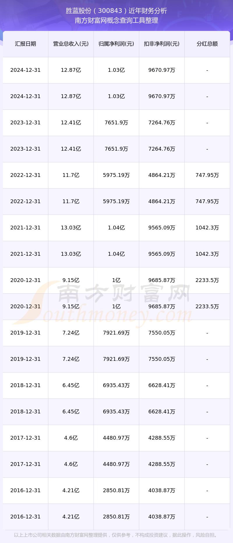 勝藍(lán)股份公司2024年實(shí)現(xiàn)營收12.87億元,凈利潤1.03億元,毛利率23.86%。