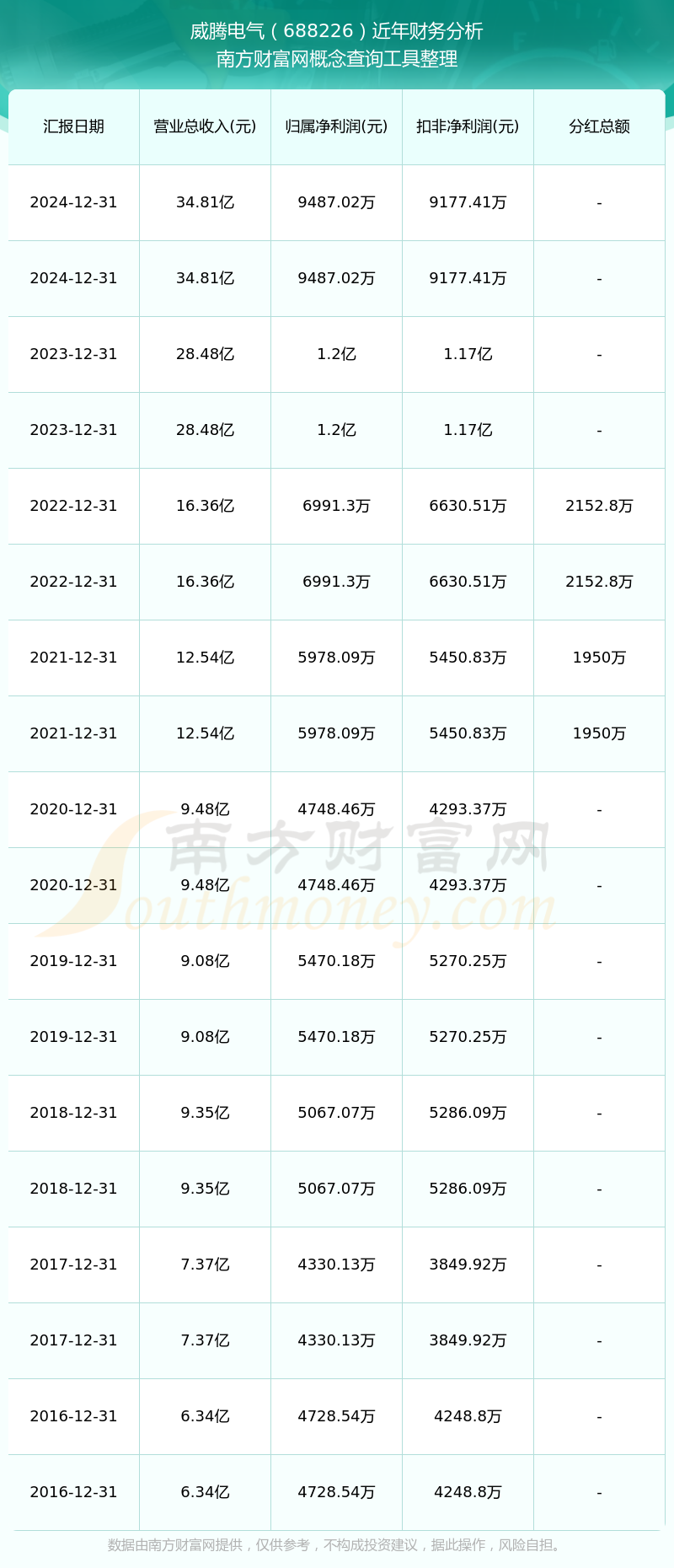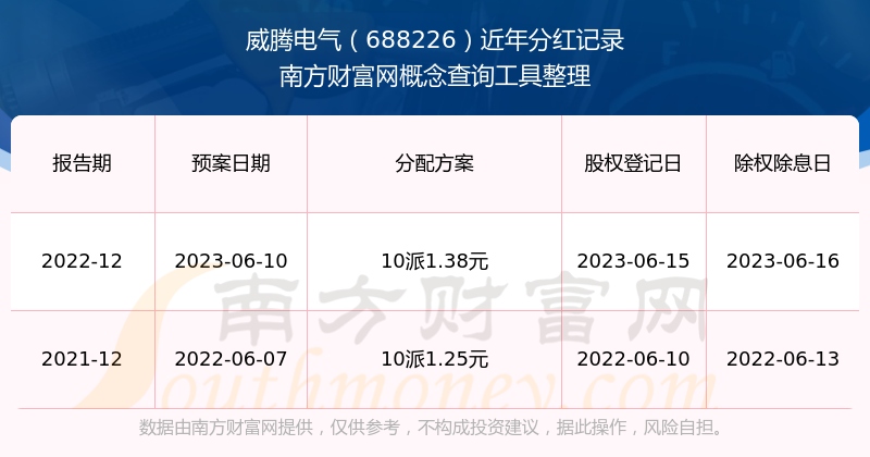 威騰電氣最新一次公布的分紅方案為10派1.38元。本次權(quán)益分派股權(quán)登記日為2023年6月15日,除權(quán)除息日為2023年6月16日,派息日為2023年6月16日。