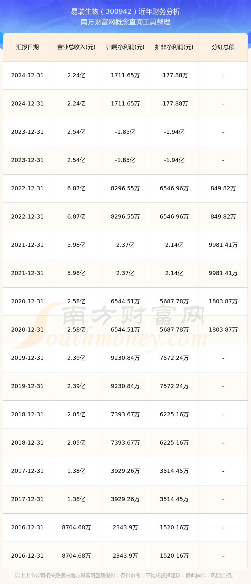 2024年報顯示,易瑞生物實現(xiàn)營收2.24億,同比增長-11.75%;凈利潤1711.65萬,同比增長109.26%;毛利率70.63%。