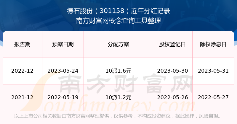 德石股份最新一次公布的分紅方案:10派1.6元。