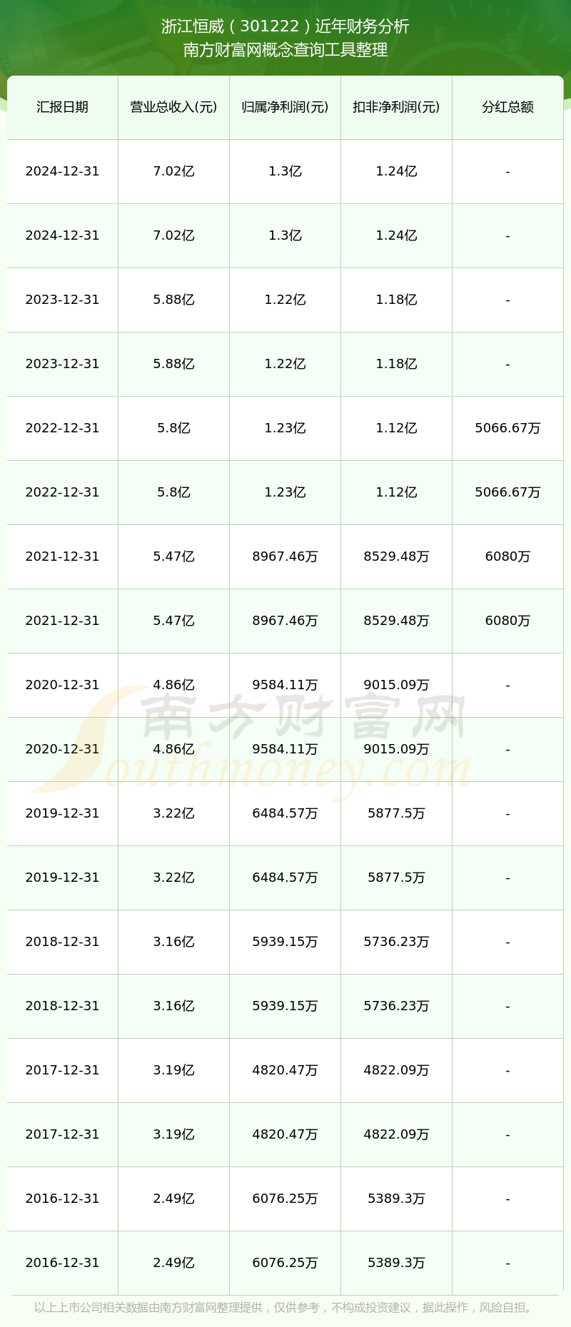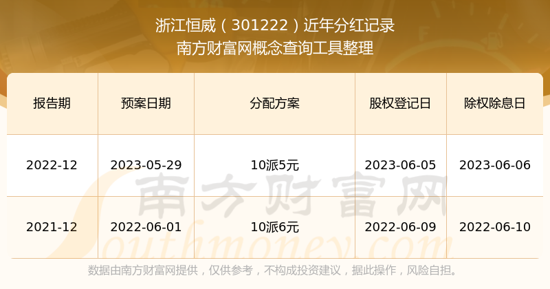 浙江恒威最新一次公布的分紅方案為10派5元。本次權(quán)益分派股權(quán)登記日為2023年6月5日,除權(quán)除息日為2023年6月6日,派息日為2023年6月6日。