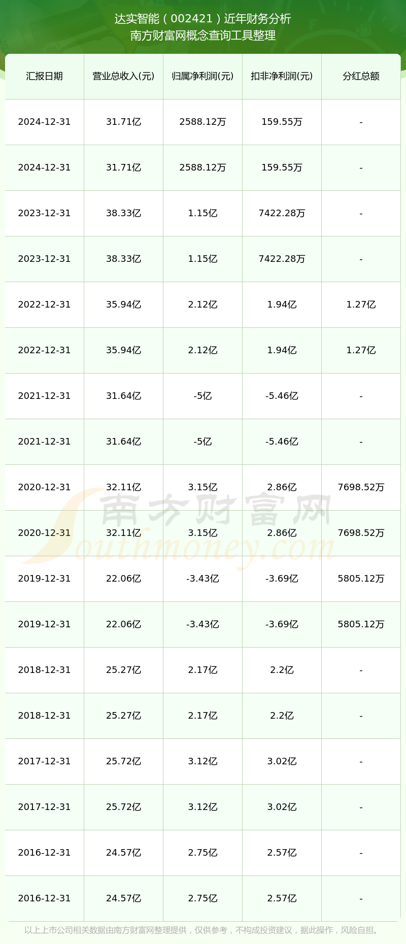 達實智能歷年分紅派息情況如下表所示: