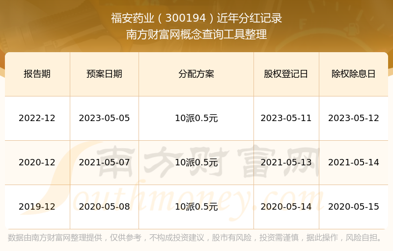 福安藥業(yè)最新一次公布的分紅方案為10派0.5元。本次權(quán)益分派股權(quán)登記日為2023年5月11日,除權(quán)除息日為2023年5月12日,派息日為2023年5月12日。