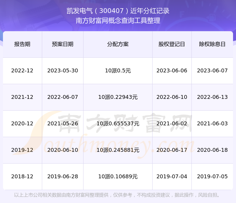 凱發(fā)電氣最新一次公布的分紅方案為10派0.5元。本次權(quán)益分派股權(quán)登記日為2023年6月6日,除權(quán)除息日為2023年6月7日,派息日為2023年6月7日。