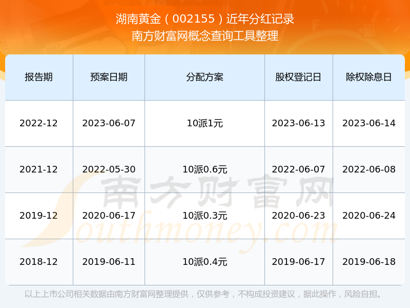 湖南黃金最新一次公布的分紅方案為10派1元。本次權(quán)益分派股權(quán)登記日為2023年6月13日,除權(quán)除息日為2023年6月14日,派息日為2023年6月14日。