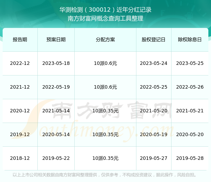 華測檢測最新一次公布的分紅方案為10派0.6元。本次權益分派股權登記日為2023年5月24日,除權除息日為2023年5月25日,派息日為2023年5月25日。