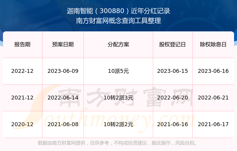 迦南智能最新一次公布的分紅方案為10派5元。本次權益分派股權登記日為2023年6月15日,除權除息日為2023年6月16日,派息日為2023年6月16日。