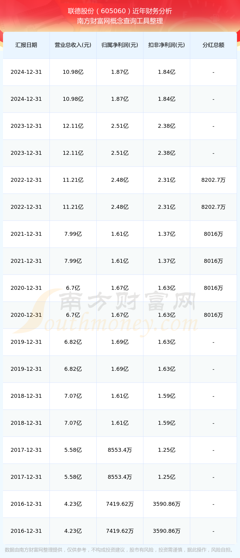 聯(lián)德股份歷年分紅派息情況如下表所示: