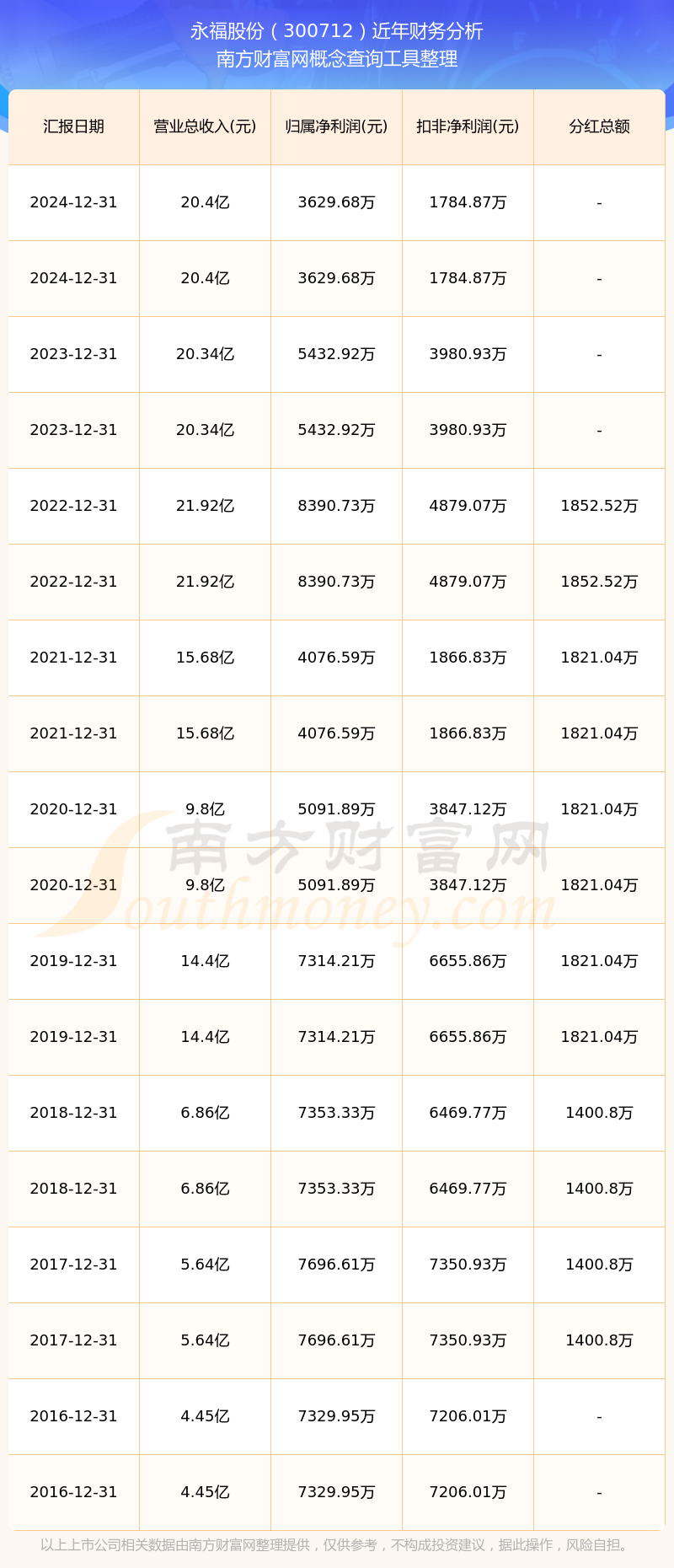 永福股份2024年總營收20.4億,同比增長0.3%;凈利潤3629.68萬,同比增長-33.19%;銷售毛利率18.23%。