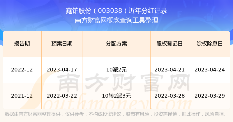 鑫鉑股份最新一次公布的分紅方案為10派2元。本次權(quán)益分派股權(quán)登記日為2023年4月21日,除權(quán)除息日為2023年4月24日,派息日為2023年4月24日。