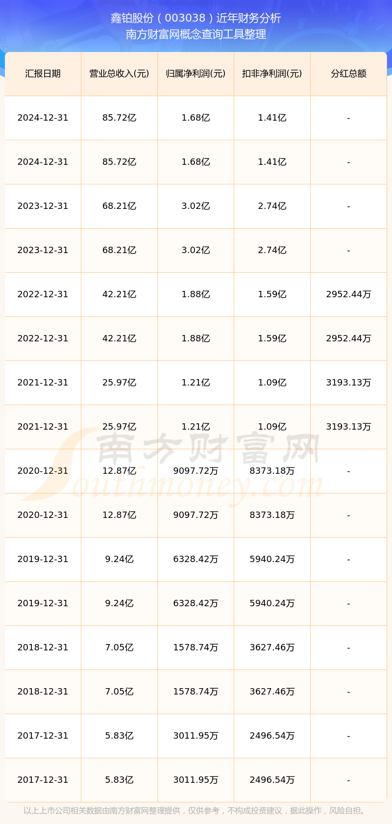 2024年鑫鉑股份總營收85.72億,同比增長25.67%;凈利潤1.68億,同比增長-44.32%;銷售毛利率7.41%。