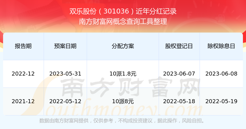雙樂股份最新一次公布的分紅方案為10派1.8元。本次權(quán)益分派股權(quán)登記日為2023年6月7日,除權(quán)除息日為2023年6月8日,派息日為2023年6月8日。