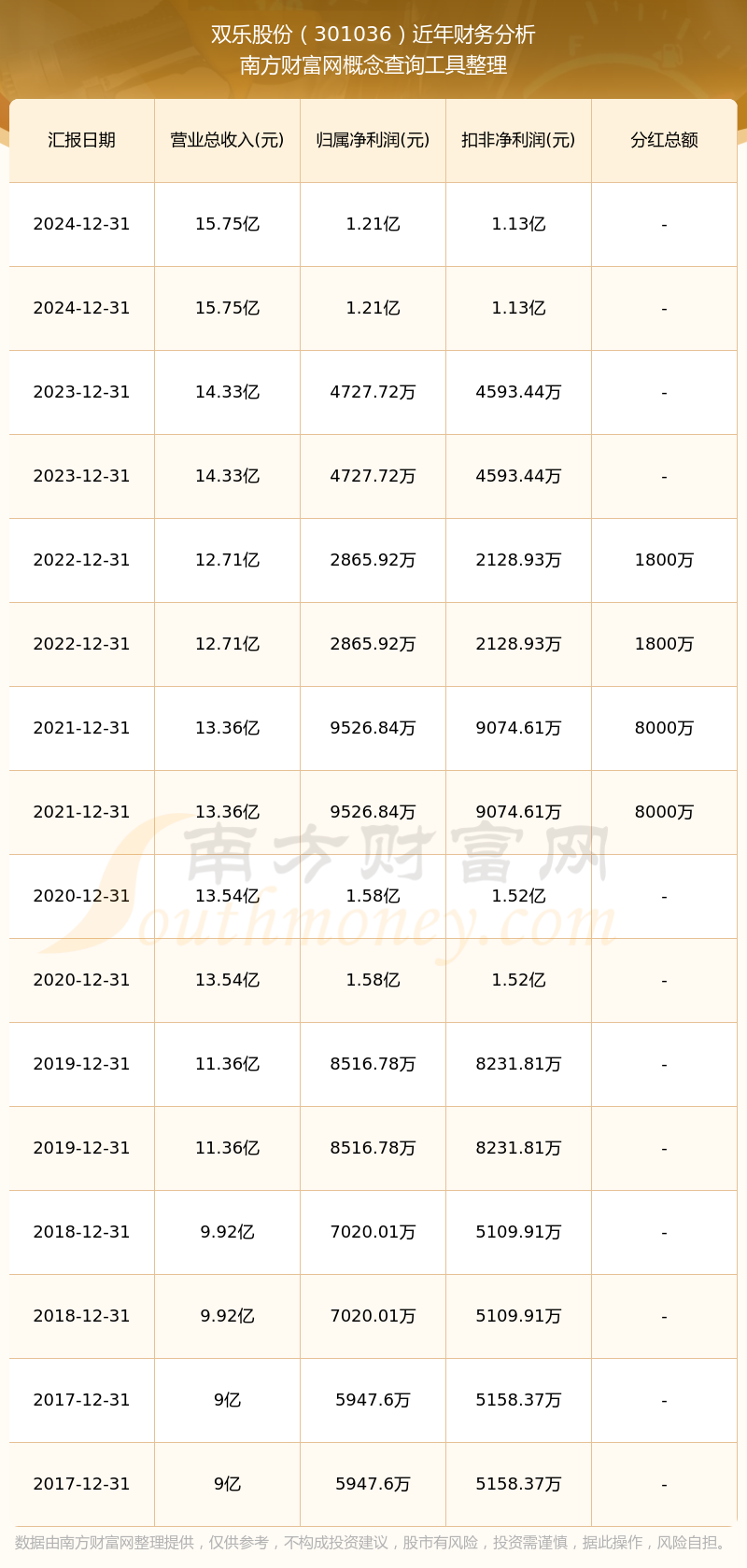 近年雙樂股份分紅派息情況如下表所示: