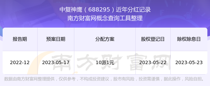 中復(fù)神鷹最新一次公布的分紅方案為10派1元。本次權(quán)益分派股權(quán)登記日為2023年5月22日,除權(quán)除息日為2023年5月23日,派息日為2023年5月23日。