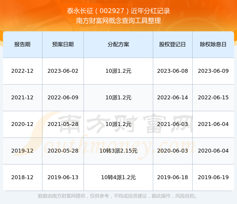 泰永長(zhǎng)征最新一次公布的分紅方案為10派1.2元。本次權(quán)益分派股權(quán)登記日為2023年6月8日,除權(quán)除息日為2023年6月9日,派息日為2023年6月9日。