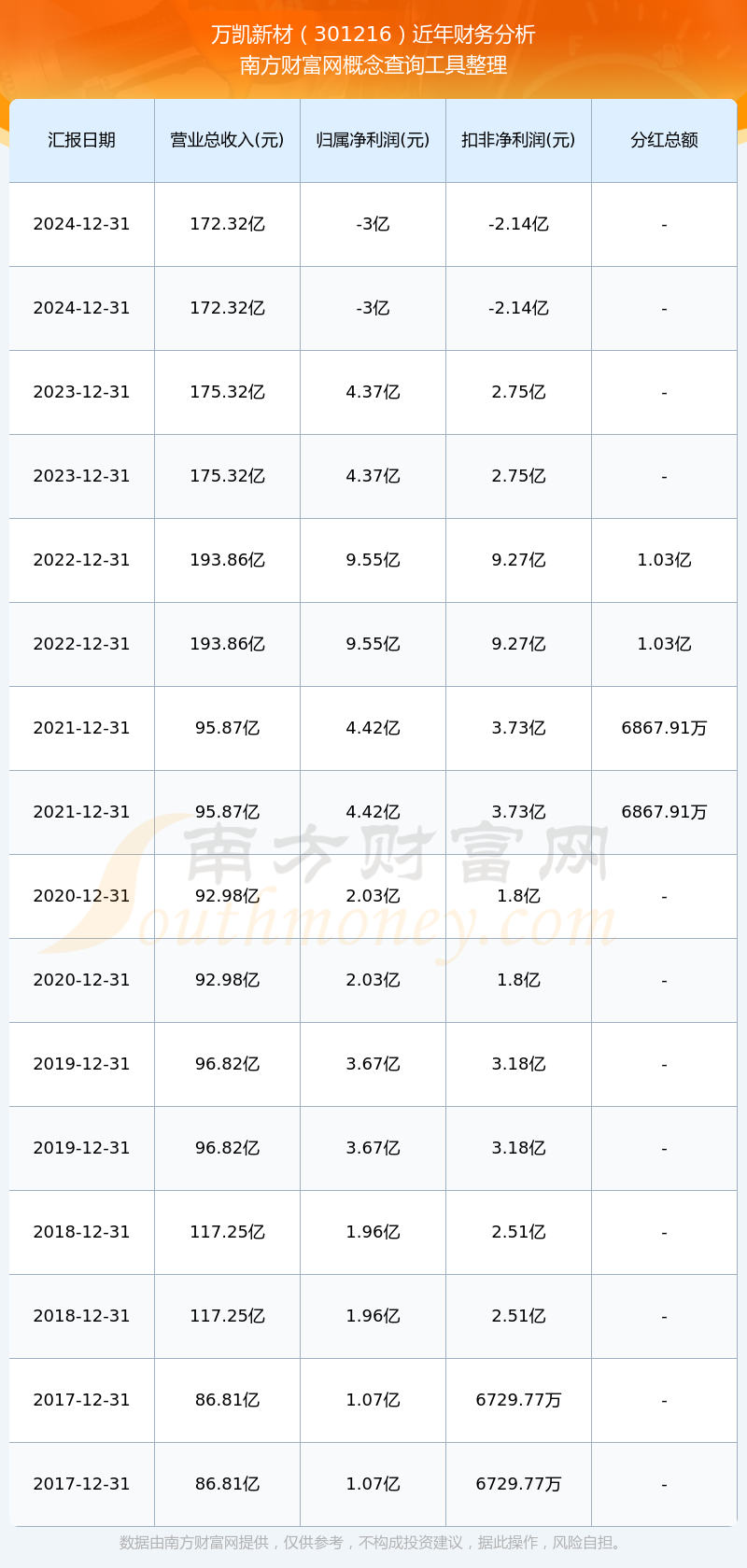 萬凱新材歷年分紅派息情況如下表所示: