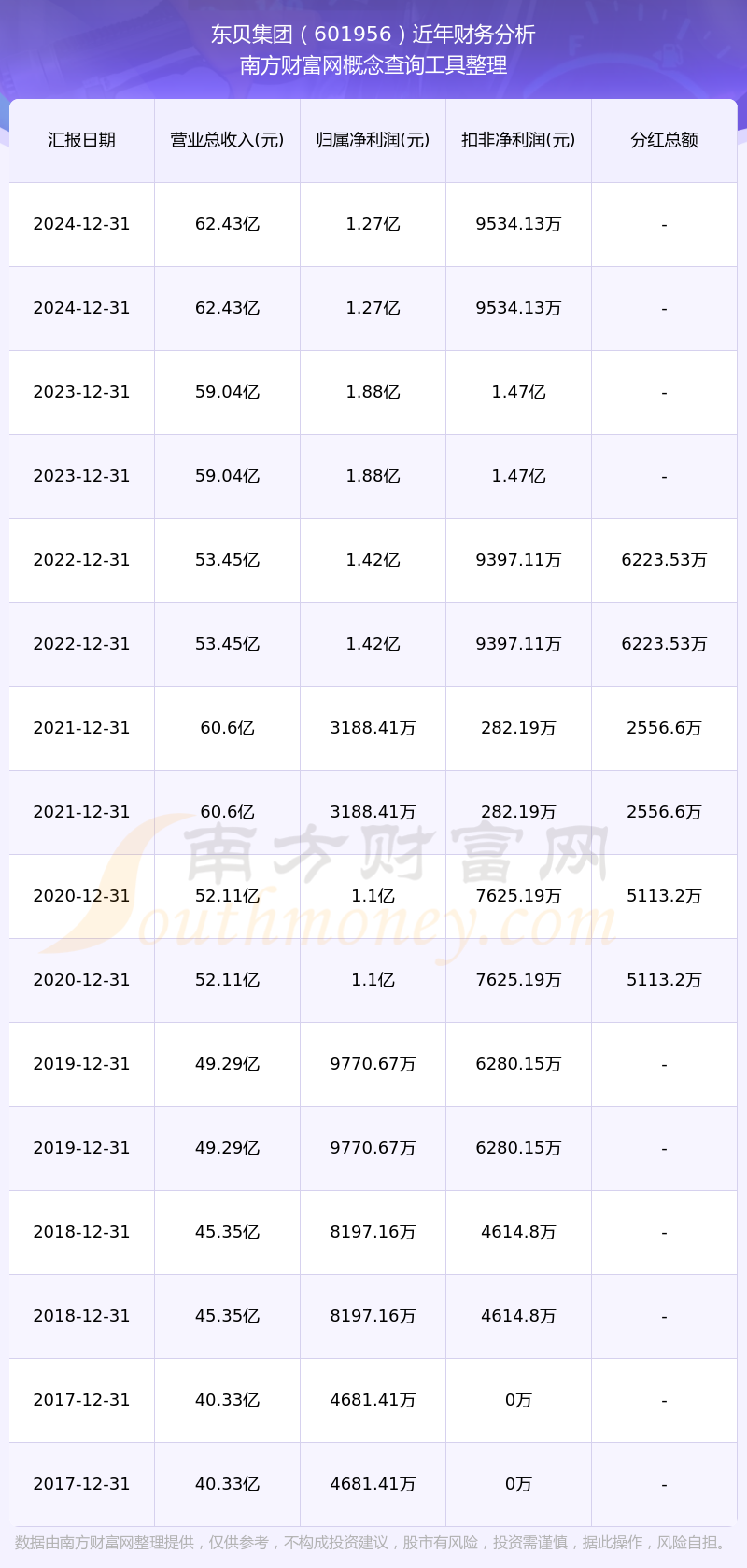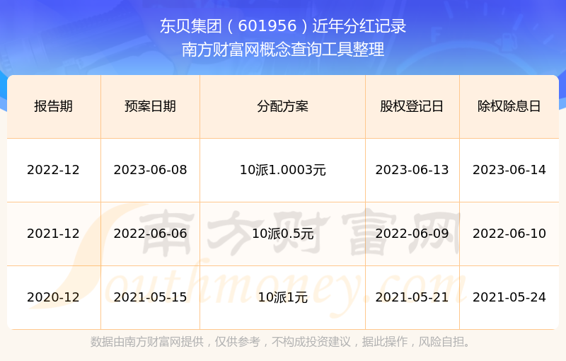 近年?yáng)|貝集團(tuán)分紅派息情況如下表所示: