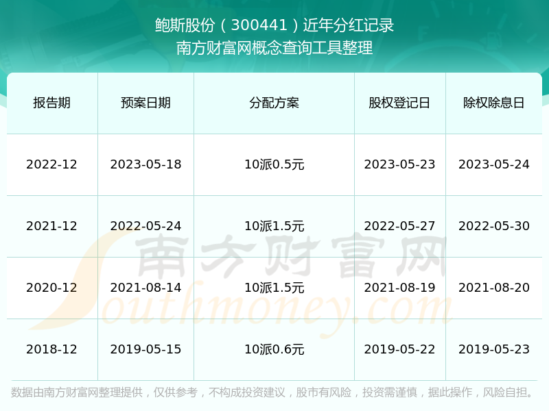 近年鮑斯股份分紅派息情況如下表所示: