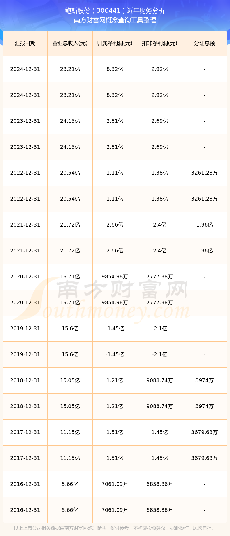 2024年報(bào)顯示,鮑斯股份實(shí)現(xiàn)營(yíng)收23.21億,同比增長(zhǎng)-3.9%;凈利潤(rùn)8.32億,同比增長(zhǎng)196.58%;毛利率33.59%。