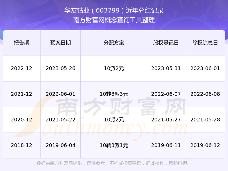 華友鈷業(yè)最新一次公布的分紅方案為10派2元。本次權(quán)益分派股權(quán)登記日為2023年5月31日,除權(quán)除息日為2023年6月1日,派息日為2023年6月1日。