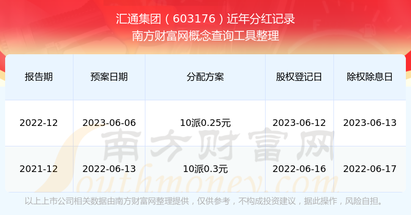 匯通集團最新一次公布的分紅方案為10派0.25元。本次權益分派股權登記日為2023年6月12日,除權除息日為2023年6月13日,派息日為2023年6月13日。