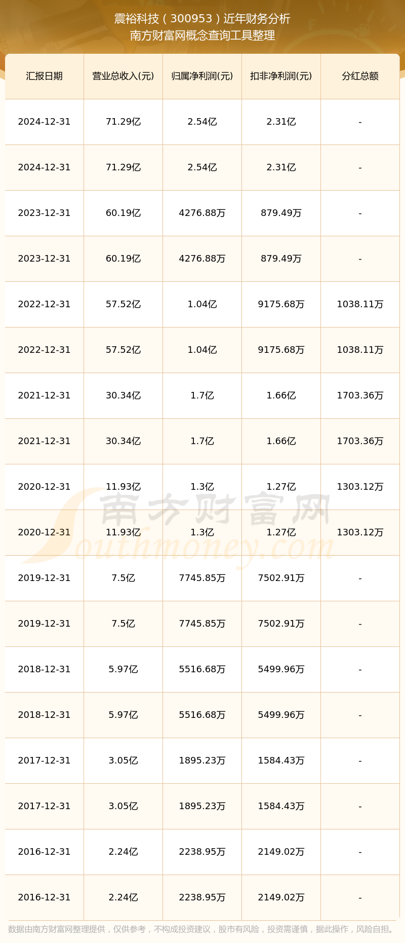 震裕科技歷年分紅派息情況如下表所示: