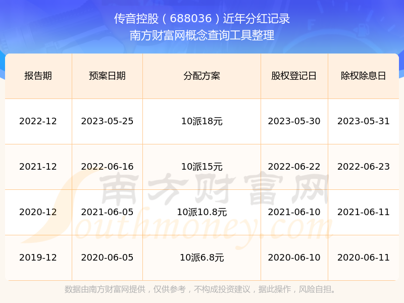 傳音控股最新一次公布的分紅方案為10派18元。本次權(quán)益分派股權(quán)登記日為2023年5月30日,除權(quán)除息日為2023年5月31日,派息日為2023年5月31日。