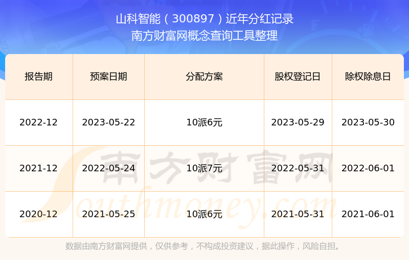 山科智能最新一次公布的分紅方案為10派6元。本次權(quán)益分派股權(quán)登記日為2023年5月29日,除權(quán)除息日為2023年5月30日,派息日為2023年5月30日。
