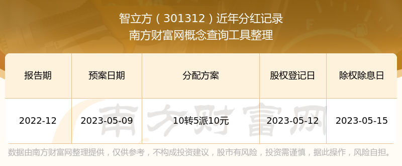 智立方最新一次公布的分紅方案為10轉(zhuǎn)5派10元。本次權(quán)益分派股權(quán)登記日為2023年5月12日,除權(quán)除息日為2023年5月15日,派息日為2023年5月15日。