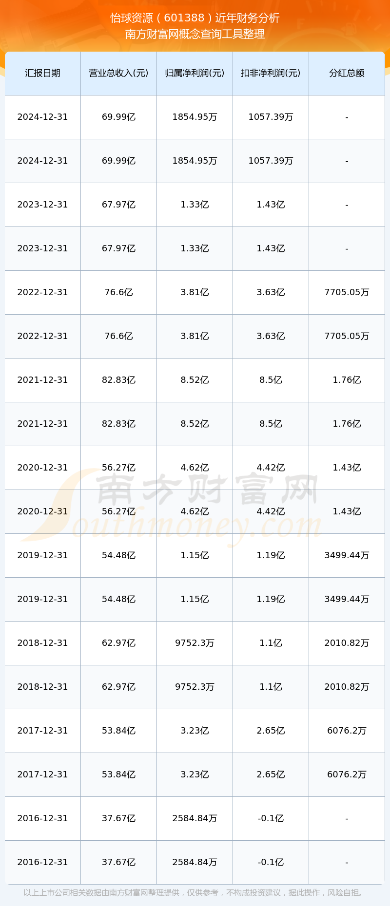 怡球資源公司2024年實現(xiàn)營業(yè)收入69.99億元,同比增長2.98%;凈利潤1854.95萬元,同比增長-86.04%;毛利率5.23%。