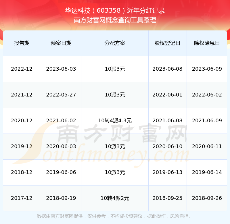 華達(dá)科技最新一次公布的分紅方案為10派3元。本次權(quán)益分派股權(quán)登記日為2023年6月8日,除權(quán)除息日為2023年6月9日,派息日為2023年6月9日。