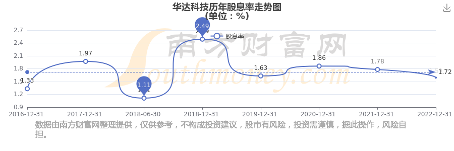 華達(dá)科技?xì)v年股息率走勢(shì)如下圖: