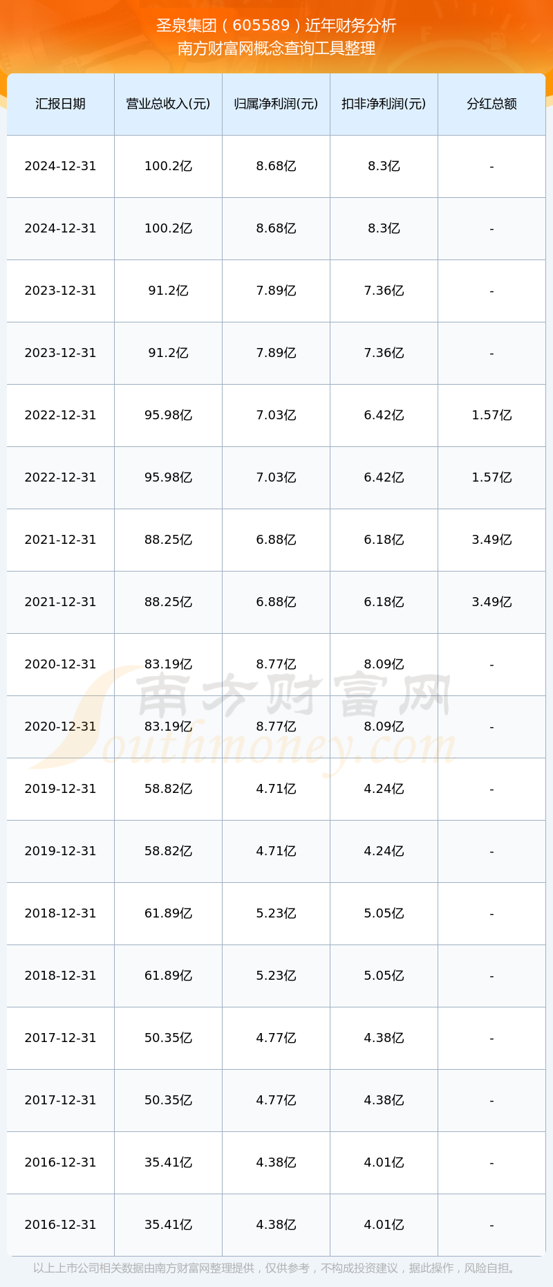 圣泉集團(tuán)歷年分紅派息情況如下表所示:
