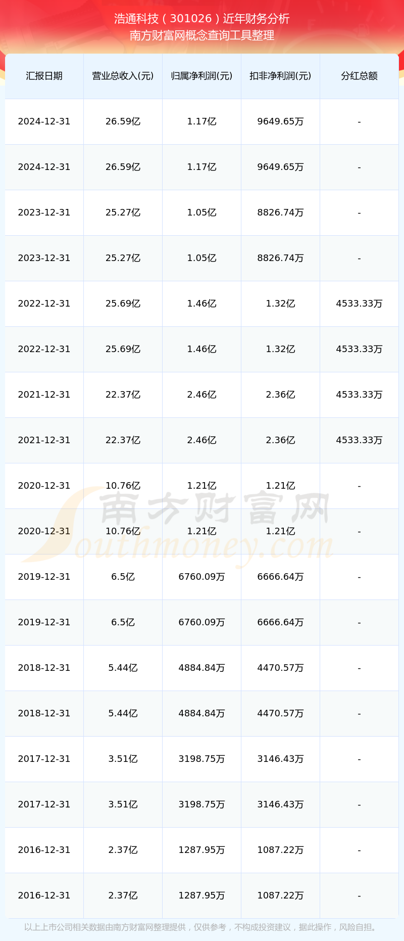 浩通科技?xì)v年分紅派息情況如下表所示: