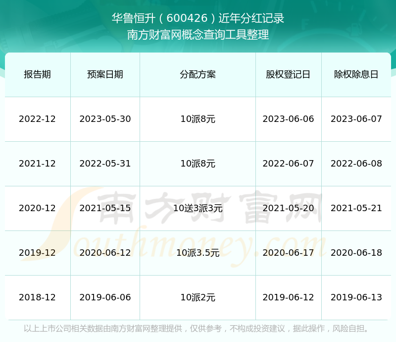 華魯恒升最新一次公布的分紅方案為10派8元。本次權(quán)益分派股權(quán)登記日為2023年6月6日,除權(quán)除息日為2023年6月7日,派息日為2023年6月7日。