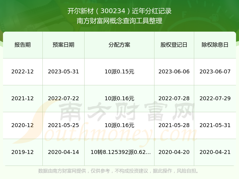 開(kāi)爾新材最新一次公布的分紅方案為10派0.15元。本次權(quán)益分派股權(quán)登記日為2023年6月6日,除權(quán)除息日為2023年6月7日,派息日為2023年6月7日。