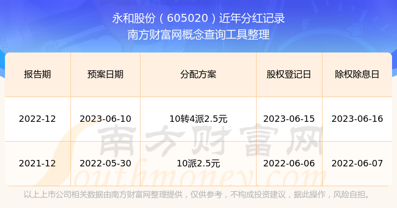 永和股份最新一次公布的分紅方案為10轉(zhuǎn)4派2.5元。本次權(quán)益分派股權(quán)登記日為2023年6月15日,除權(quán)除息日為2023年6月16日,派息日為2023年6月16日。