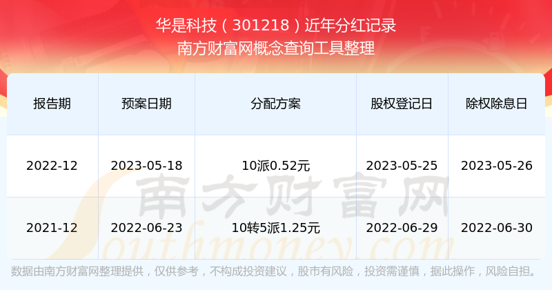 華是科技最新一次公布的分紅方案為10派0.52元。本次權(quán)益分派股權(quán)登記日為2023年5月25日,除權(quán)除息日為2023年5月26日,派息日為2023年5月26日。