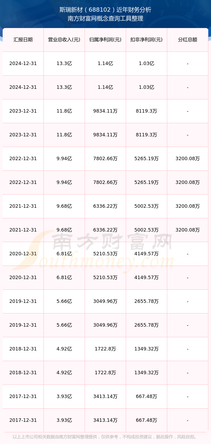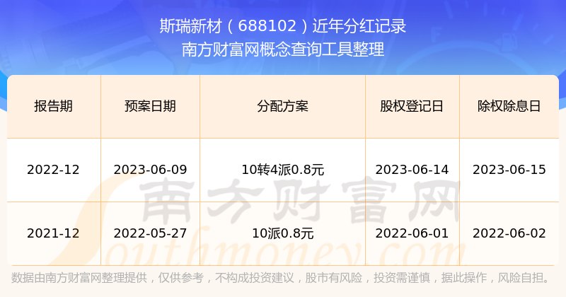 斯瑞新材最新一次公布的分紅方案為10轉4派0.8元。本次權益分派股權登記日為2023年6月14日,除權除息日為2023年6月15日,派息日為2023年6月15日。