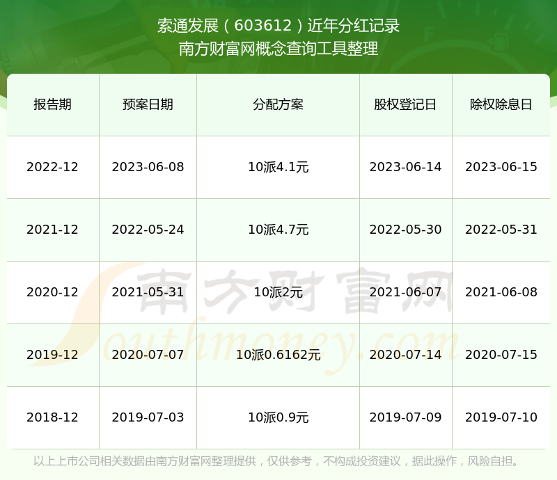 索通發(fā)展最新一次公布的分紅方案為10派4.1元。本次權(quán)益分派股權(quán)登記日為2023年6月14日,除權(quán)除息日為2023年6月15日,派息日為2023年6月15日。