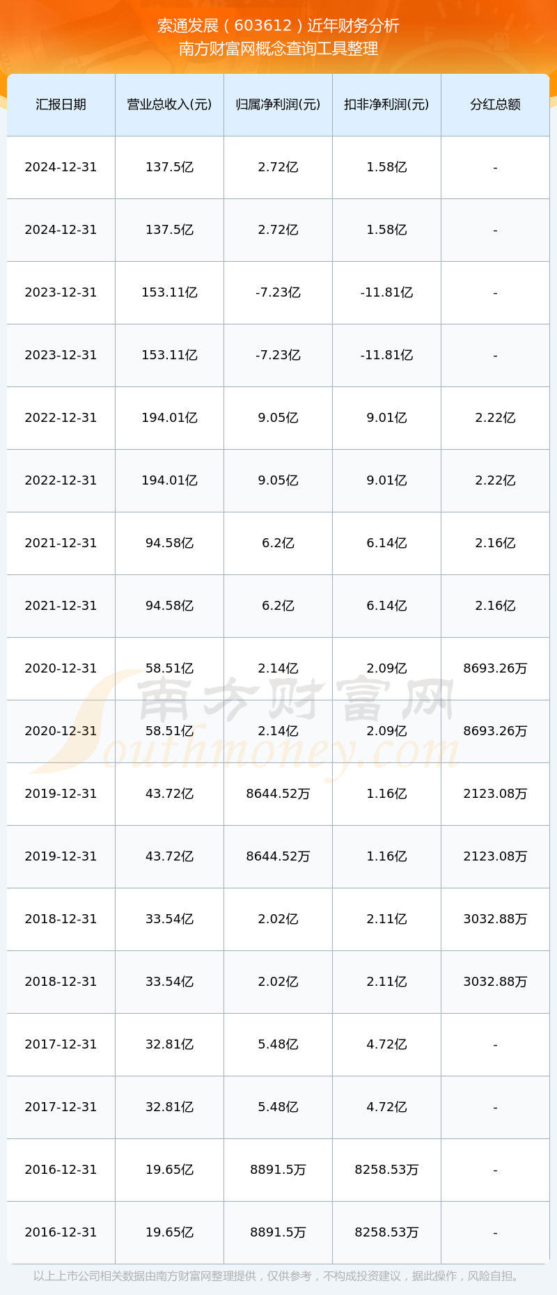索通發(fā)展歷年分紅派息情況如下表所示: