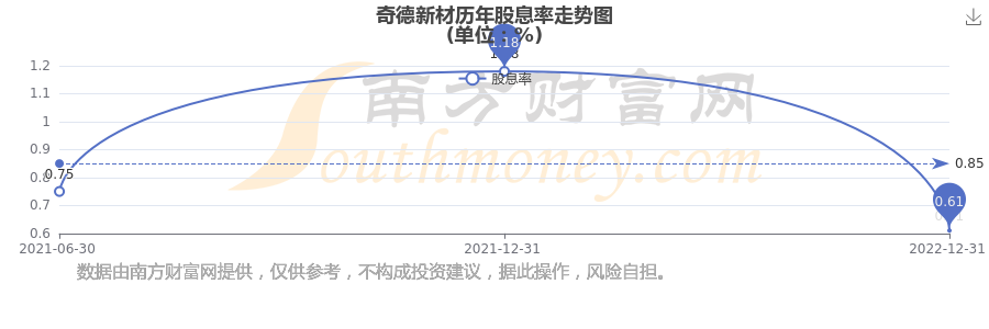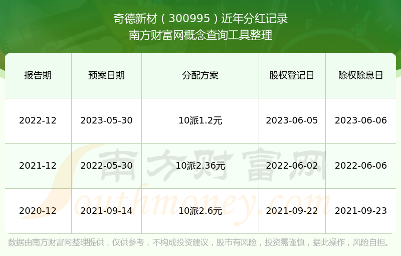 奇德新材最新一次公布的分紅方案為10派1.2元。本次權(quán)益分派股權(quán)登記日為2023年6月5日,除權(quán)除息日為2023年6月6日,派息日為2023年6月6日。