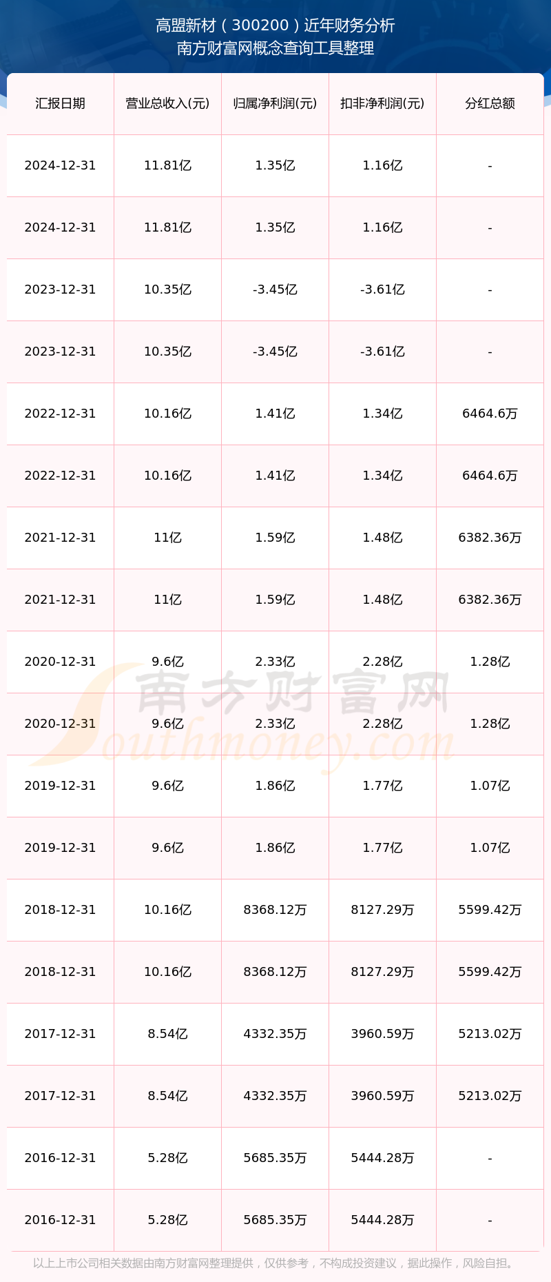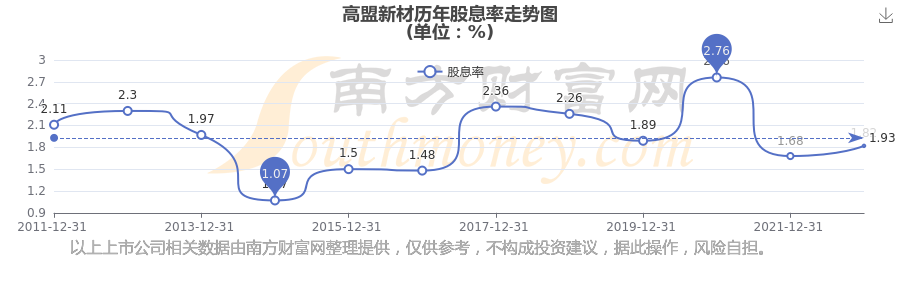 高盟新材最新一次公布的分紅方案為10派1.5元。本次權益分派股權登記日為2023年6月15日,除權除息日為2023年6月16日,派息日為2023年6月16日。