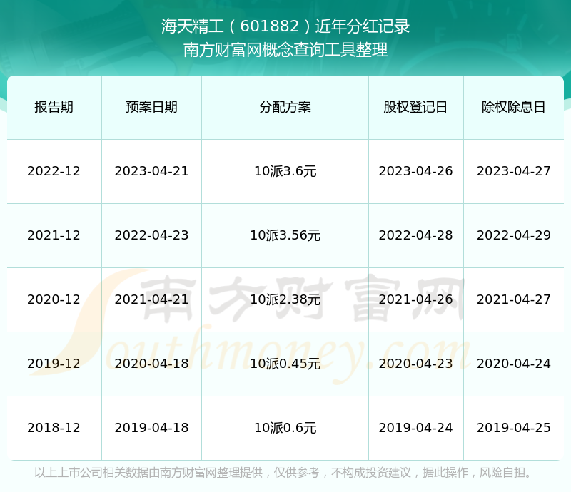 海天精工最新一次公布的分紅方案:10派3.6元。