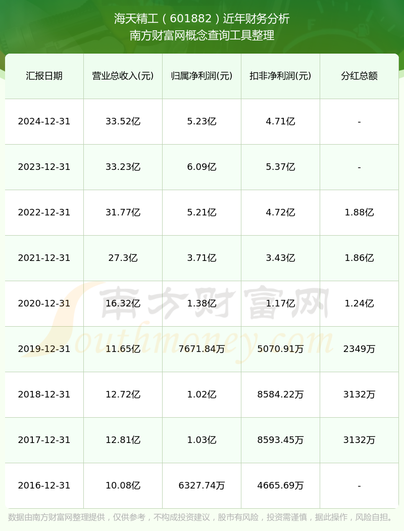 海天精工2024年總營收33.52億,同比增長0.85%;凈利潤5.23億,同比增長-14.19%;銷售毛利率27.34%。
