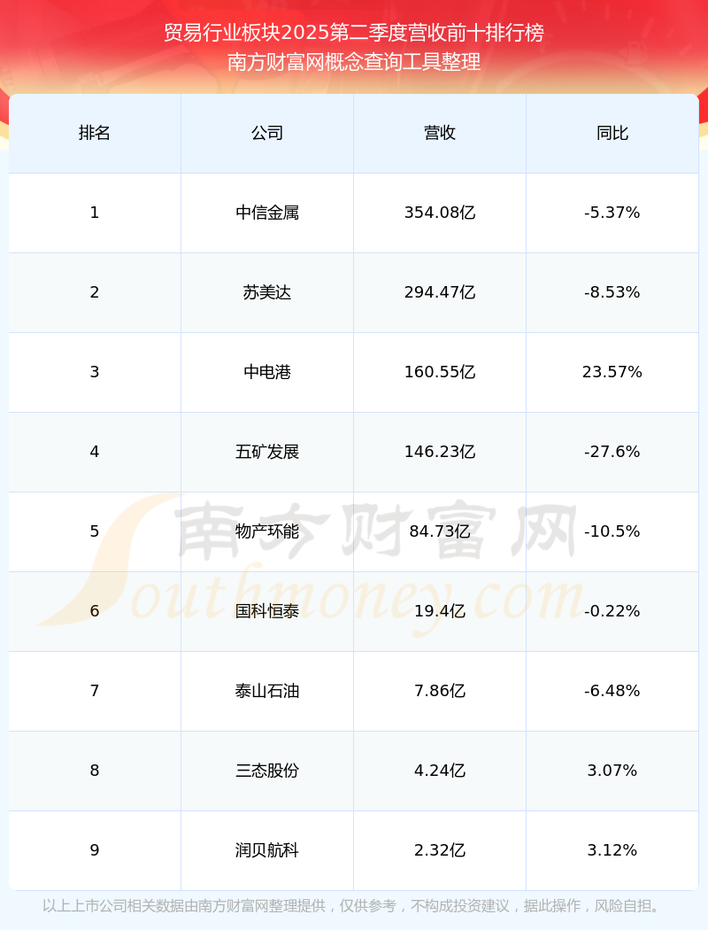 按照南方財(cái)富網(wǎng)概念查詢工具統(tǒng)計(jì),該股所屬板塊為貿(mào)易行業(yè)板塊,該板塊共有9只股票,蘇美達(dá)2025第二季度營收在該板塊中排名為第2名,該板塊2025第二季度營收排名前十的股票如下表: