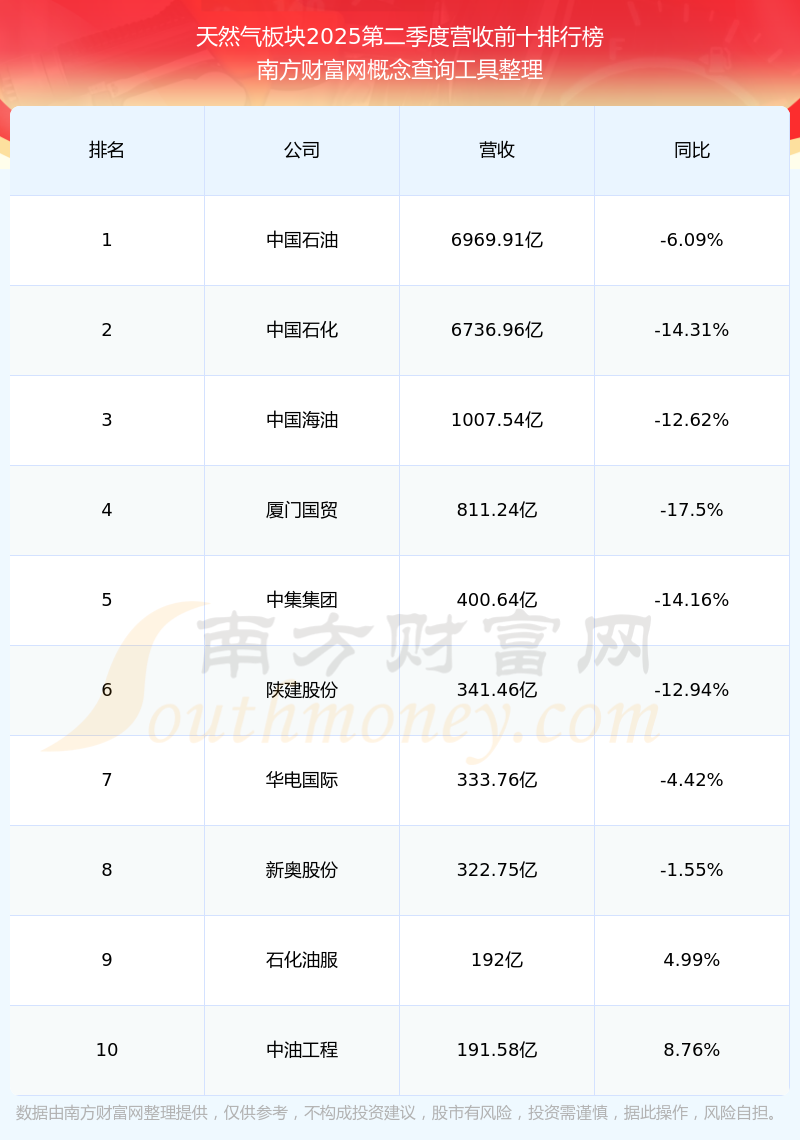 按照南方財(cái)富網(wǎng)概念查詢工具統(tǒng)計(jì),該股所屬板塊為天然氣板塊,該板塊共有154只股票,陜建股份2025第二季度營(yíng)收在該板塊中排名為第6名,該板塊2025第二季度營(yíng)收排名前十的股票如下表: