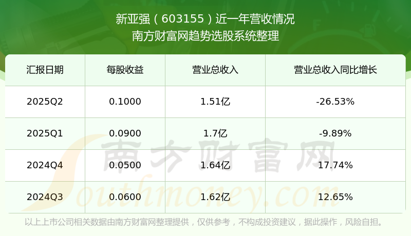 在2025年第二季度,新亞強的業(yè)績表現(xiàn),主營業(yè)務(wù)收入達到1.51億元,實現(xiàn)了-26.53%的同比增長率。同時,公司歸母凈利潤錄得2816.61萬元,同比增長-41.82%。