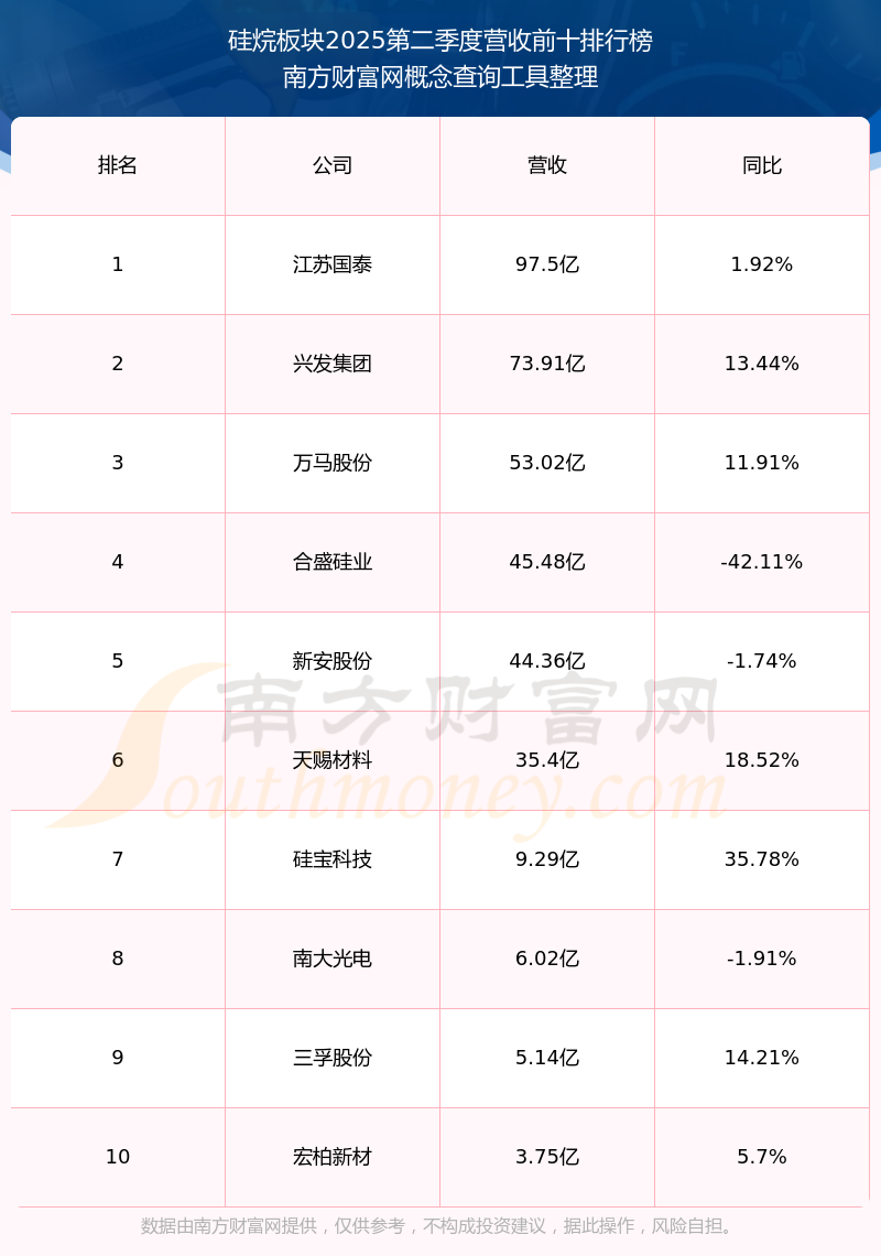 按照南方財富網(wǎng)概念查詢工具統(tǒng)計,該股所屬板塊為硅烷板塊,該板塊共有13只股票,新亞強2025第二季度營收在該板塊中排名為第13名,該板塊2025第二季度營收排名前十的股票如下表: