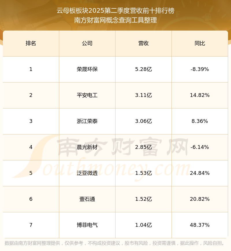 按照南方財富網概念查詢工具統(tǒng)計,該股所屬板塊為云母板板塊,該板塊共有7只股票,浙江榮泰2025第二季度營收在該板塊中排名為第3名,該板塊2025第二季度營收排名前十的股票如下表: